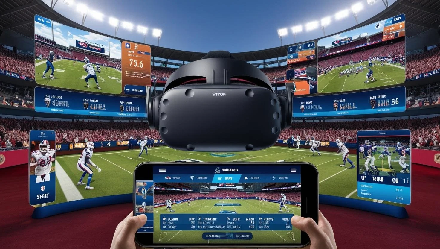 Description: Fans receive VR headsets that provide real-time, 360-degree views of the match from various vantage points, including the players' perspective on the field.